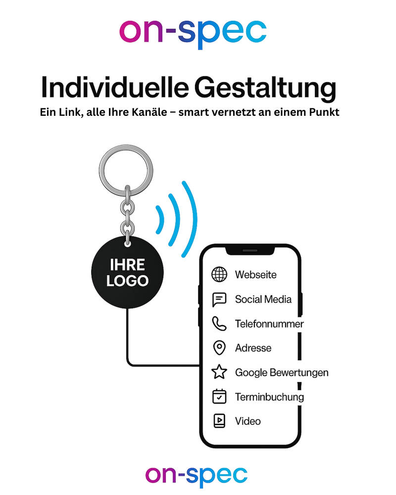 Individuelle NFC-Produkte mit Ihrem Logo und maßgeschneidertem Design inklusive Programmierung für Website- und Social-Media-Links.