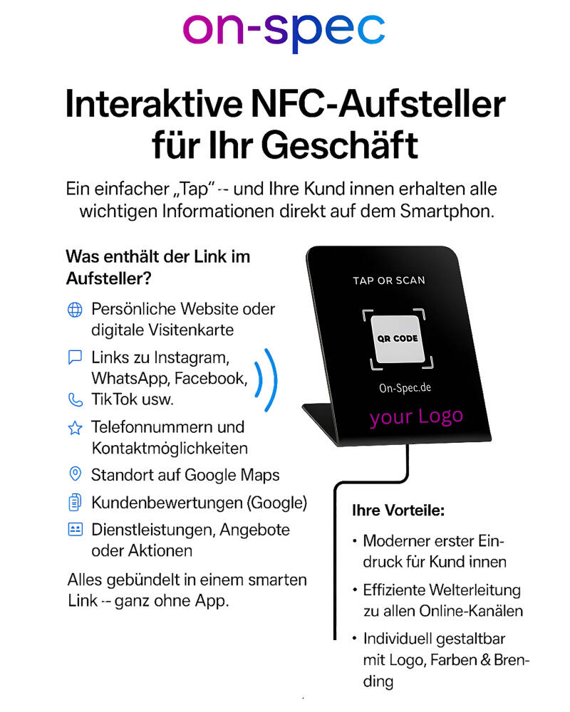 Unser Komplettservice umfasst individuelles Design mit Ihrem Logo, Programmierung nach Wunsch wie Webseite, Kontaktkarte, Social Media oder Bewertungslinks (Google, Instagram, WhatsApp) und mehr.