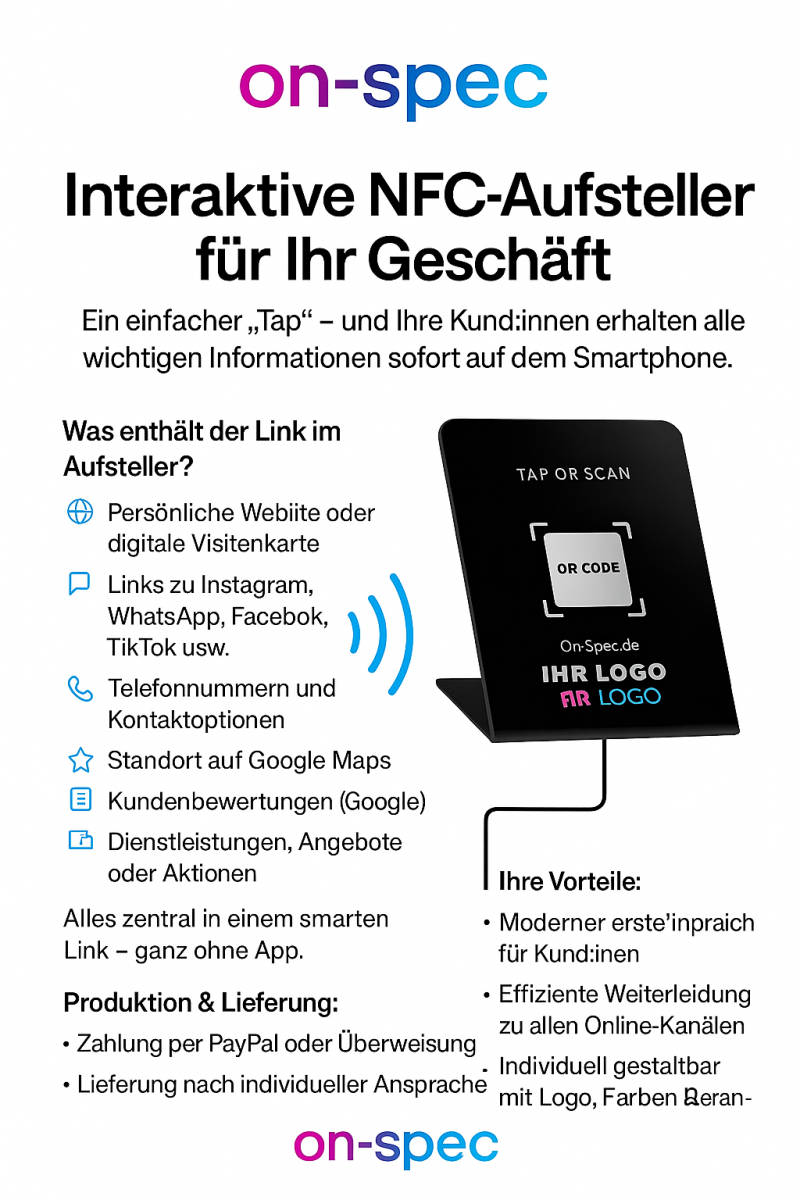 Unser Komplettservice umfasst individuelles Design mit Ihrem Logo, Programmierung nach Wunsch wie Webseite, Kontaktkarte, Social Media oder Bewertungslinks (Google, Instagram, WhatsApp) und mehr.